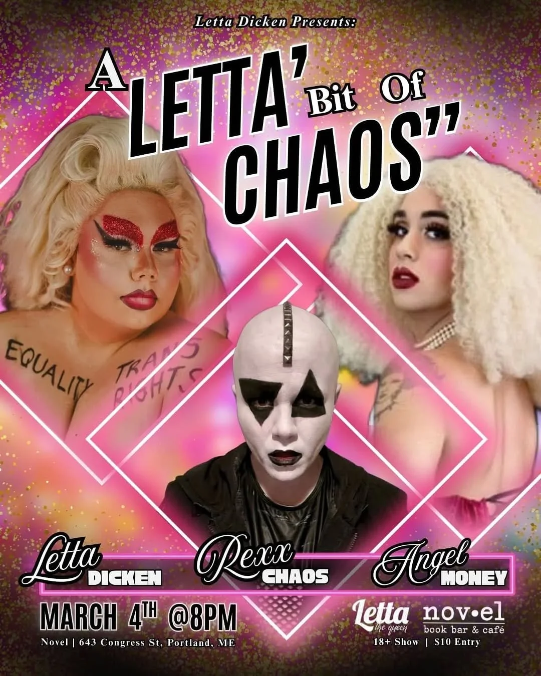 oin us at Novel for a night of fun, fierce, fabulousness, and a beautifully chaotic show; so gear up and bring yourself into the world of “A Letta’ Bit of Chaos”! Hosted by Letta Dicken & Rexx Chaos, with this month’s special guest, Angel Dionne Money. Get ready, because they’re ready to dazzle you, as you enjoy a night of queer performance art, dancing, and audience games and competition. Baby what are you waiting for? Get your tickets! It’s just A Letta’ Bit of Chaos”!