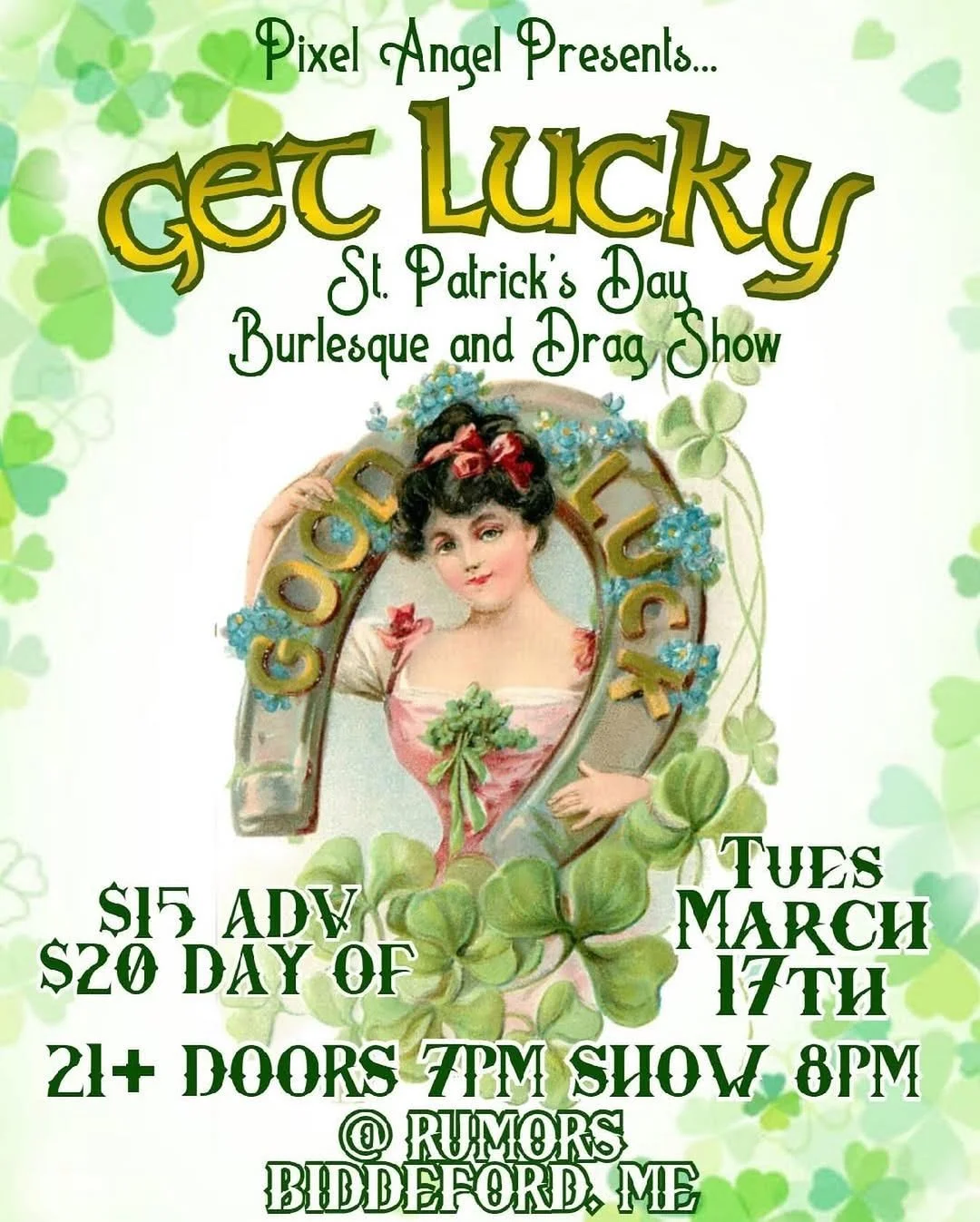 Pixel Angel Presents Get Lucky! A St Patrick's Day themed burlesque and drag show at Rumors on St. Patrick's Day!